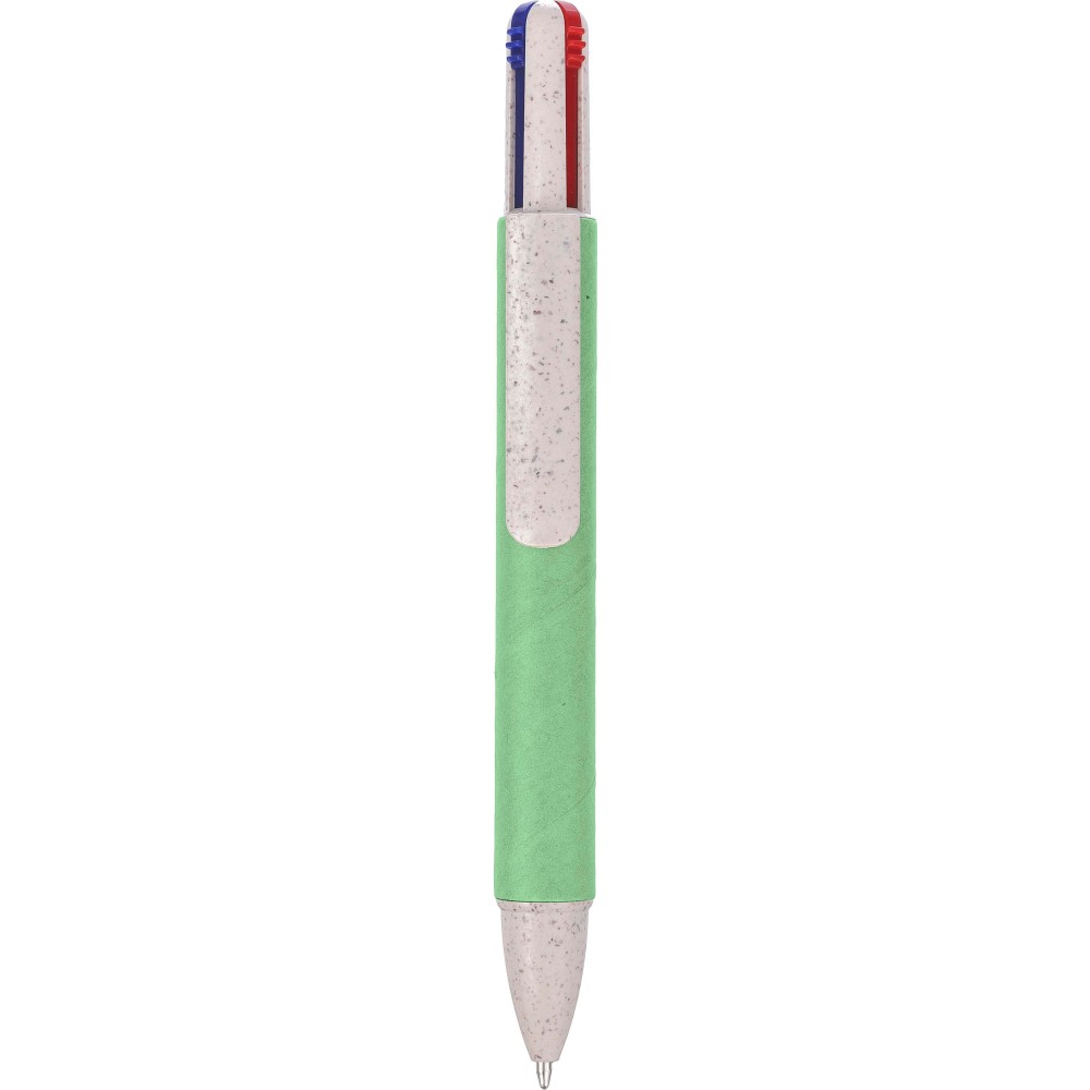 Újrahasznosított kartonból és szalmából készült négyszínű golyóstoll. Kb. 300 méter íráshossz színenként. Tollbetét színek: kék, fekete, piros és zöld.
