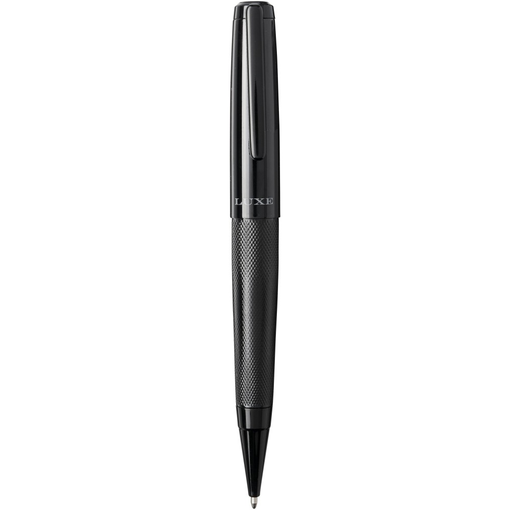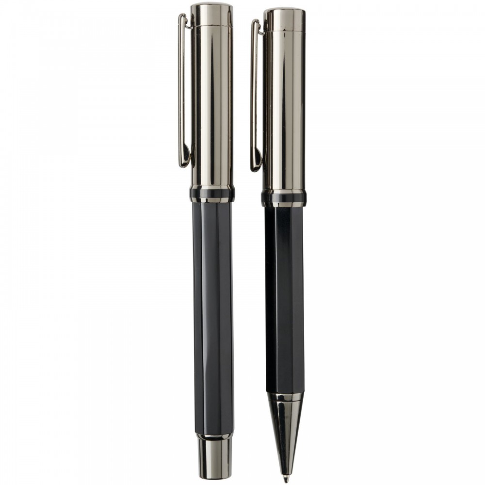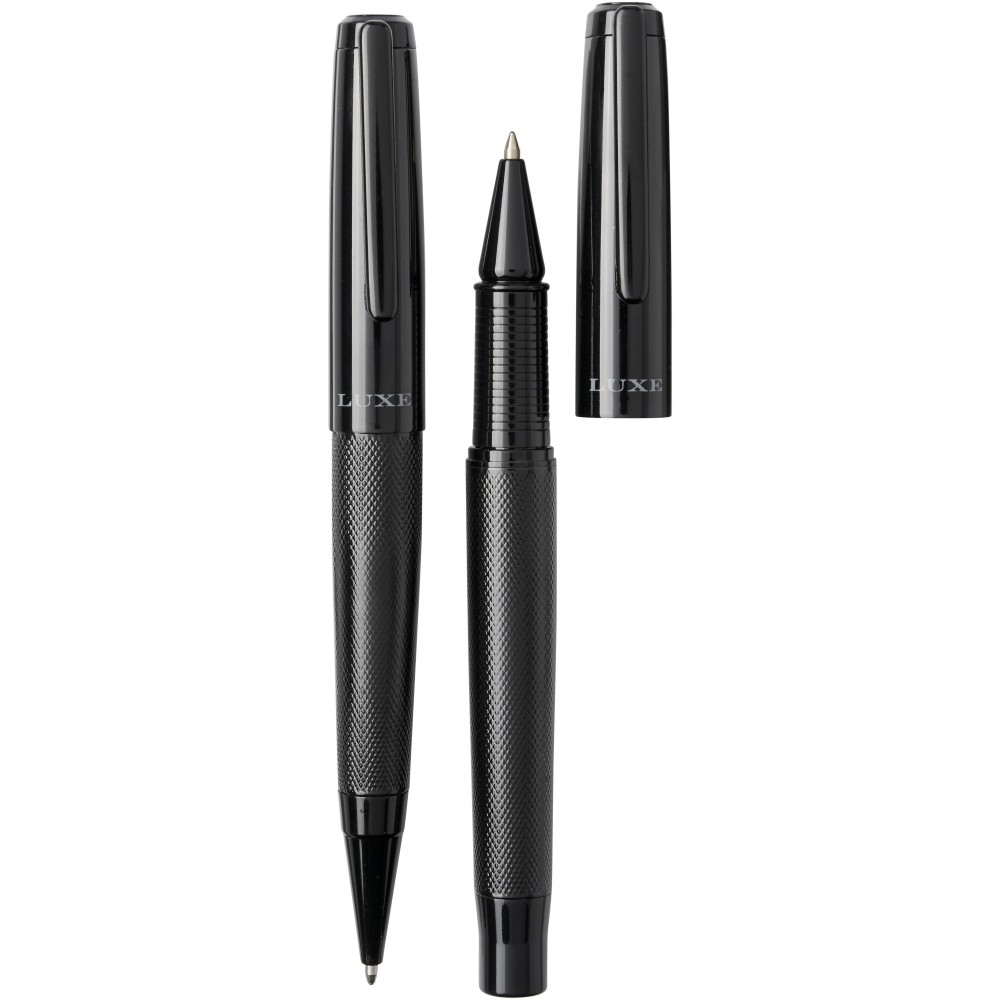 Golyóstoll és rollerball készlet Luxe díszdobozban. Golyóstoll mérete: 14 cm x 1.45 cm, súlya: 40 gr, a tollbetét írási kapacitása: 800 m. Rollerball mérete: 13.8 cm x 1.45 cm, súlya: 54 gr. Rollerball írási kapacitása: 400 m. Fém.