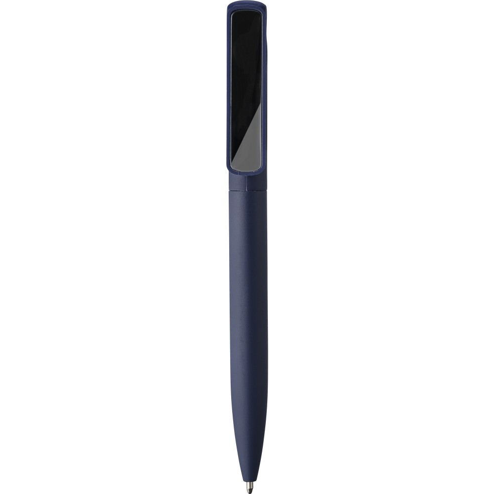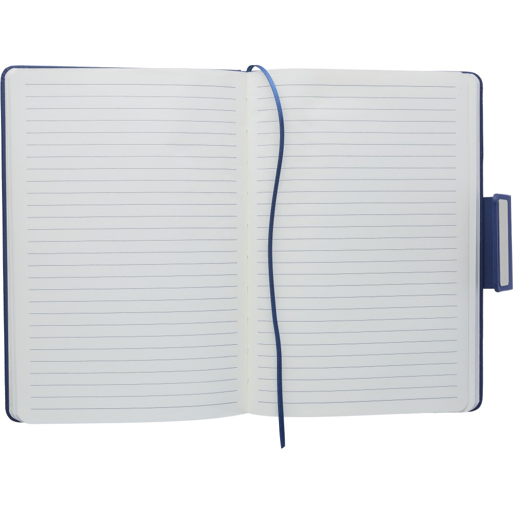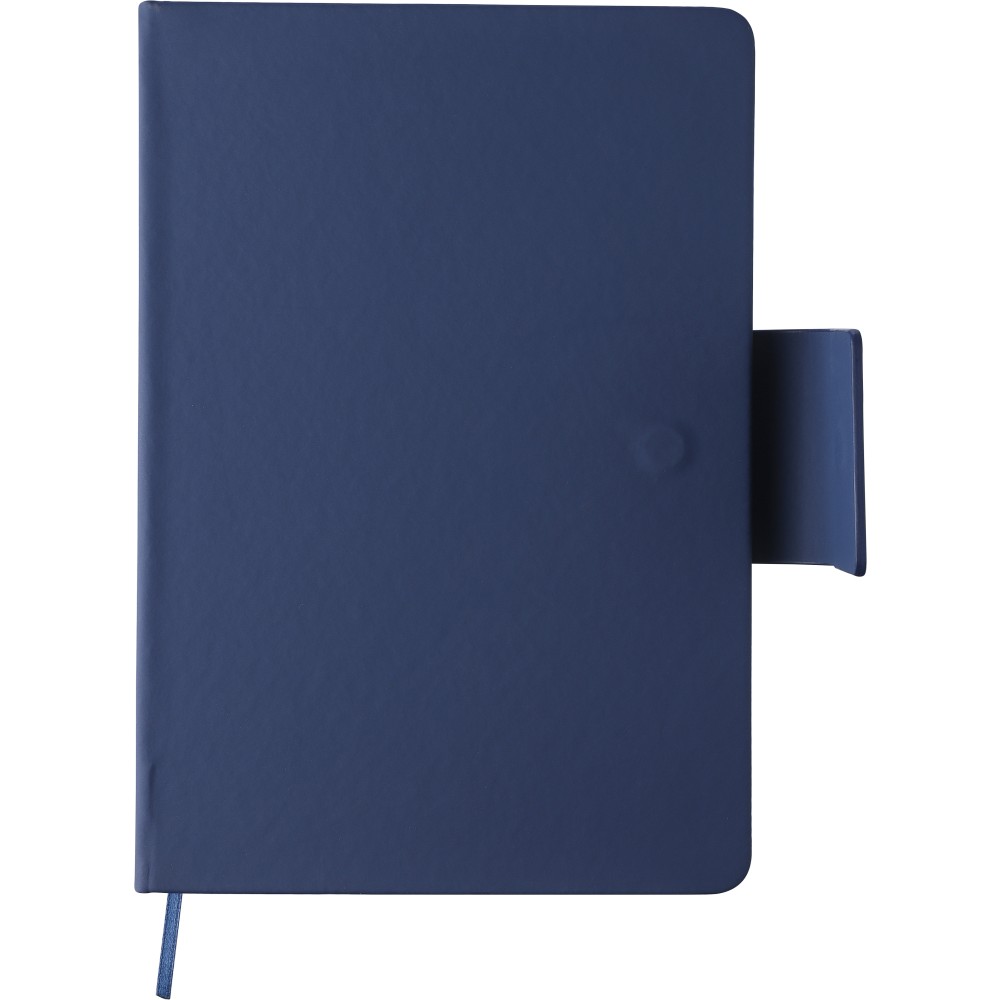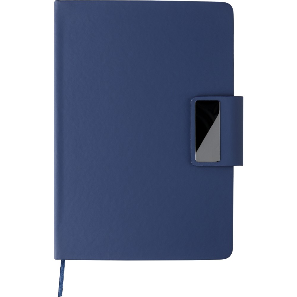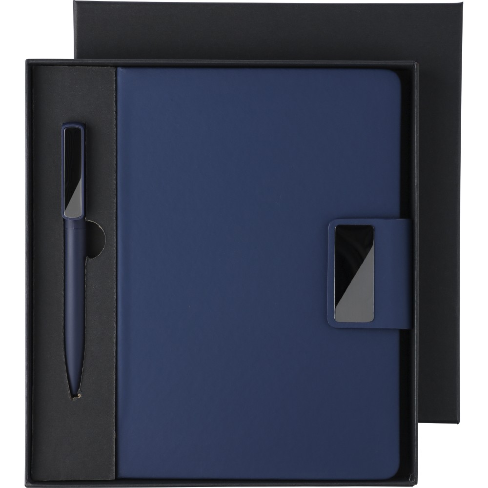Karton ajándékkészlet. Tartalma: újrahasznosított alumínium csavaros golyóstoll kék tintával és újrahasznosított PU jegyzetfüzet. A jegyzetfüzet 80 lapos 70 g/m2-es vonalas papírral, és szalagos könyvjelzőt és fém mágneses zárat tartalmaz fegyveracél gravírozott lemezzel. Mindkét termék újrahasznosított logóval van ellátva: dombornyomva a jegyzetfüzeten és gravírozva a tollon.