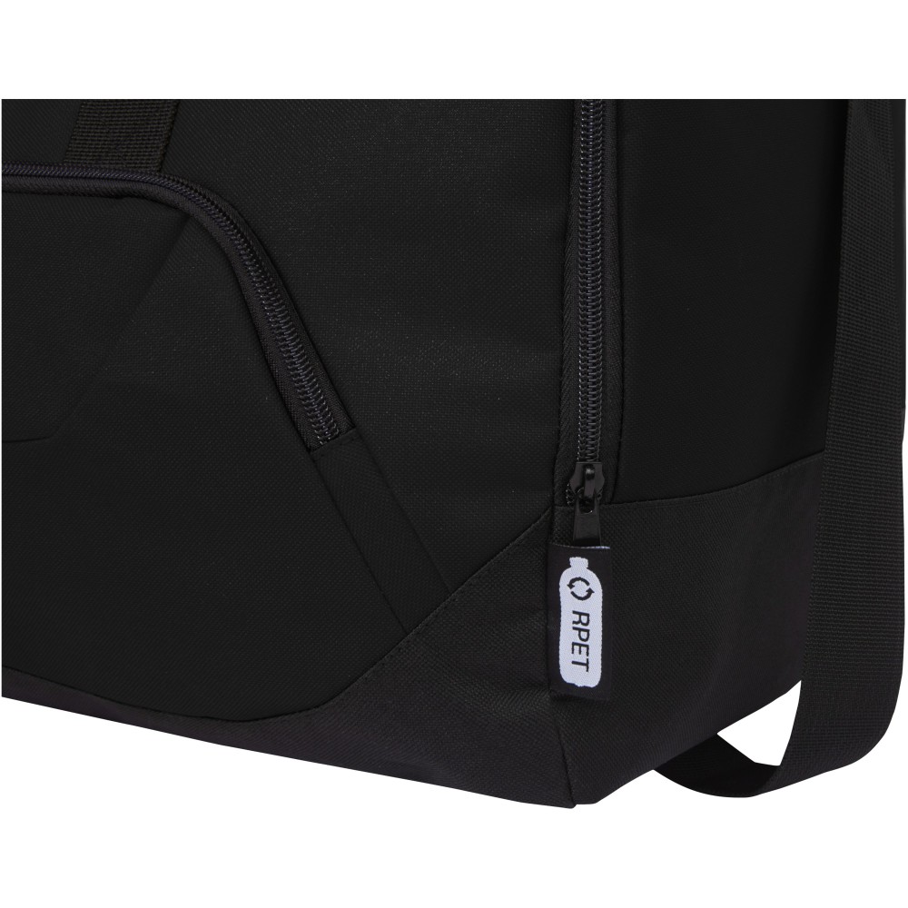 Erős táska 100% -ban újrahasznosított műanyagból, amellyel hozzájárul a műanyag hulladék csökkentéséhez. Nagyméretű fő rekesz és első cipzáras zseb, párnázott vállpánt és párnázott fogantyú. Körülbelül 27 műanyagpalack újrahasznosításával készült. 600D poliészter.