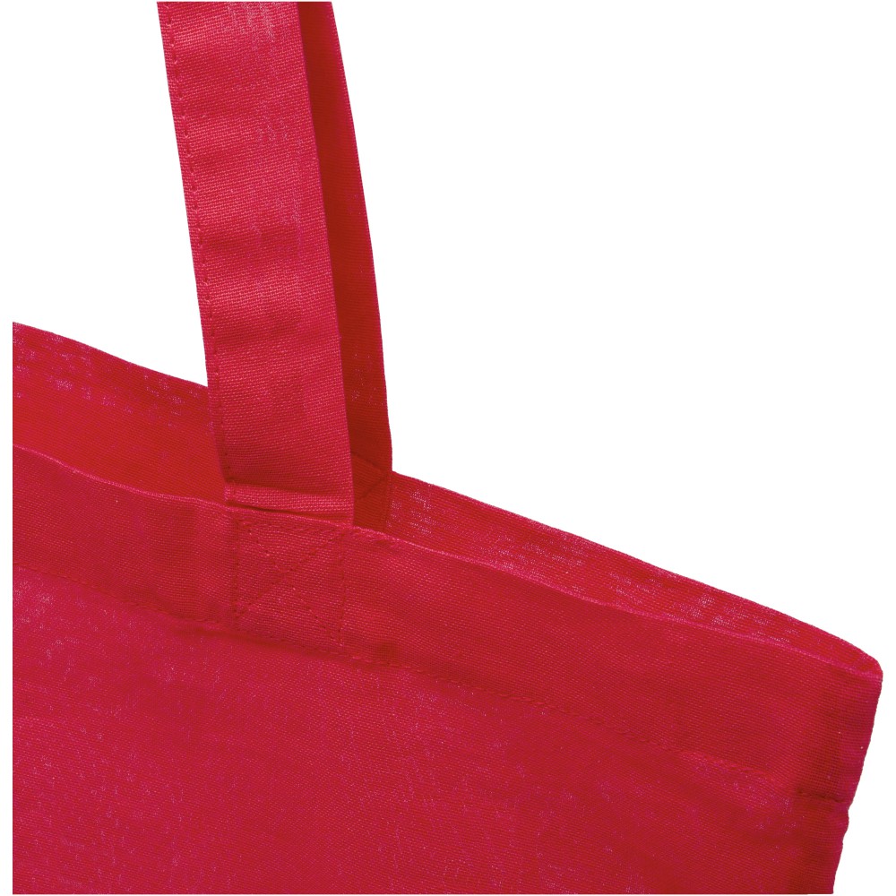 A 100%-ban GRS-tanúsítvánnyal rendelkező újrahasznosított pamutból készült Madras táska tökéletes ajándék bármilyen rendezvényen, konferencián vagy bevásárlótáskaként kisebb élelmiszerek bevásárlásához. A 140 g/m2 pamut sűrűsége a táskát masszívvá, hosszú élettartamúvá és nehéz tárgyak szállítására is alkalmassá teszi a fő rekeszben. A 30 cm hosszú vállpántjával könnyen hordozható. Indiában készült. Teherbírás 5 kg súlyig.