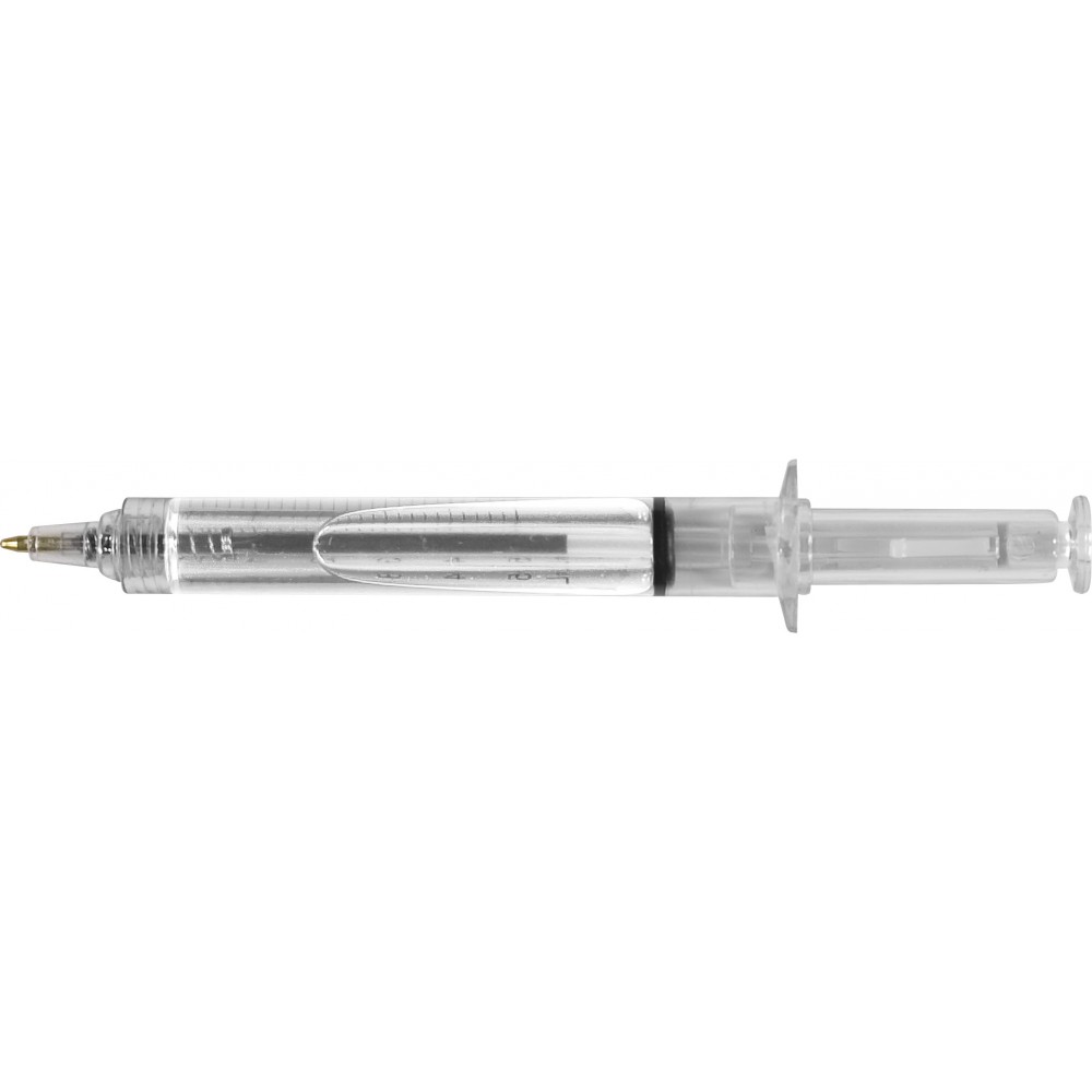 Injekció formájú golyóstoll színes folyadékkal töltve, fekete tollbetéttel.