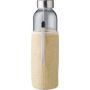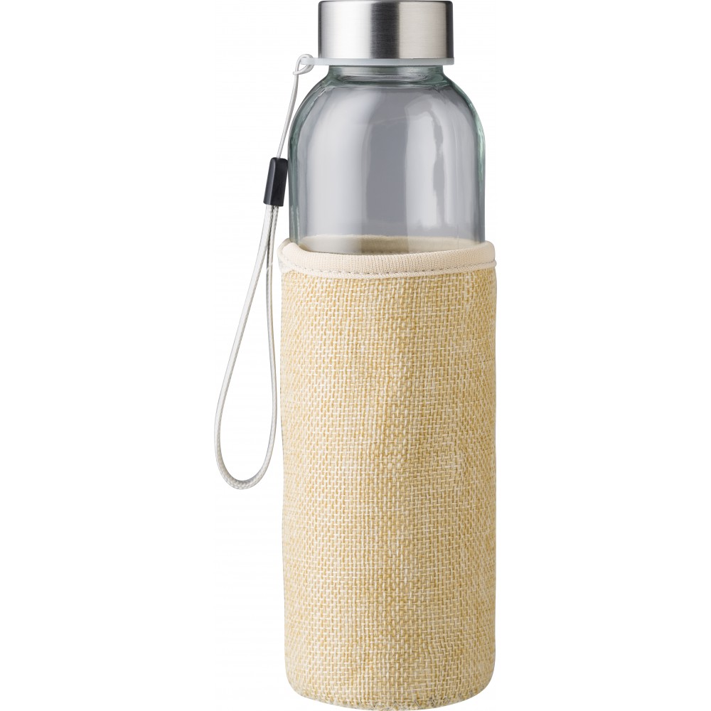 Üveg vizespalack rozsdamentes acél kupakkal, juta borítással és csuklópánttal. Csomagolása kraft papírdoboz. Űrtartalom: 500 ml.
