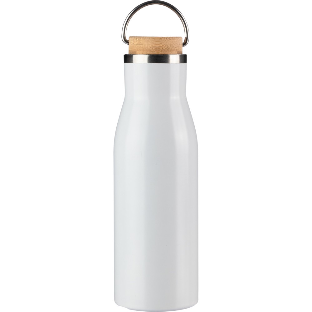 Újrahasznosított rozsdamentes acél palack bambusz kupakkal. Rozsdamentes acél 304 belül és 201 kívül. A palackon újrahasznosítást jelölő logó található. Űrtartalom: 500 ml.