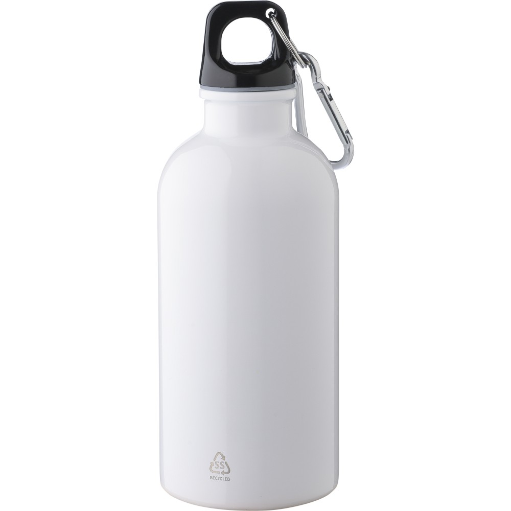 Újrahasznosított rozsdamentes acélból készült 400 ml-es szimplafalú kulacs PP kupakkal és alumínium karabinerrel. Az újrahasznosított anyagra utaló logó a palackra van gravírozva. Mosogatógépben nem tisztítható.