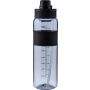 Tritán kulacs, 900 ml-es. Kétféle használati lehetőséggel: csavaros záródású kupak vagy visszahajtható végű szívószál. Szilikon markolattal, PP hordozófüllel és nyomtatott űrtartalom-jelzővel.